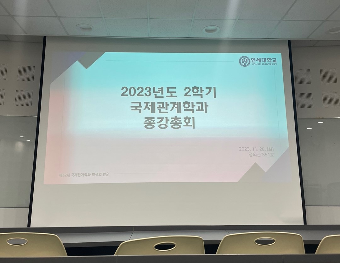 종강 총회에서 학과 교수님들의 말씀, 2학기 학과행사 활동 보고, 소모임 활동 보고가 진행되었습니다. 이번 종강총회가 국제관계학과의 2학기 마지막 행사인만큼 학우분들과 즐거운 시간을 보내고 다양한 정보를 접할 수 있는 유익한 자리였습니다!국제관계학과 학우분들의 유익하고 즐거운 학교생활을 응원합니다.